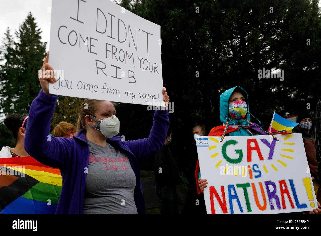 Am 20 Marz 2021 Veranstalteten Gruppen Fur Und Gegen Homosexuellenrechte Demonstrationen An Gegenuberliegenden Strassenecken Im Landlichen Konservativen Sandy Oregon Die Rivers Of Living Water United Pentecostal Church Und Die Proud Boys Eine